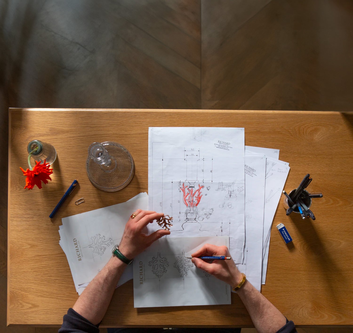 160. C’est le nombre d’heures de travail qu’aura nécessité chaque paire de flambeaux. Après avoir dessiné à la main son modèle idéal, Jean-Pierre Cottet-Dubreuil s’est attelé au design des 3 décors : Pyrite, Corail, Bouquet. Un véritable défi technique s’est posé à lui quant aux systèmes de fixation qui se devaient d'être efficaces et invisibles. Un défi relevé grâce à la dextérité de Jean-Pierre Cottet-Dubreuil et à la maitrise de son métier.
