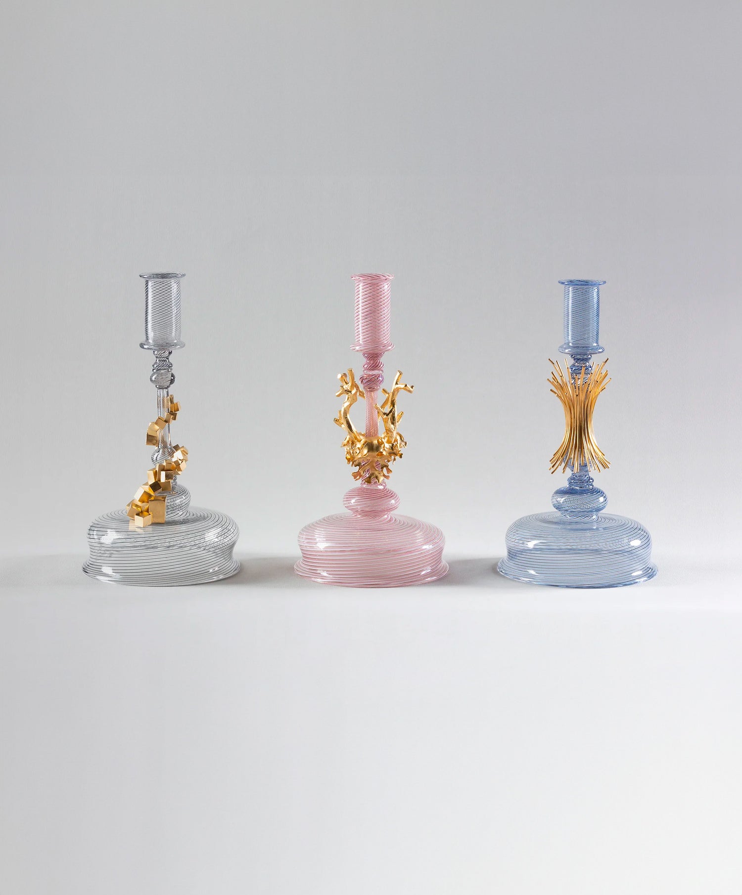 Assemblés à leur support en verre soufflé bouche, les décors semblent s’élancer dans un même mouvement à la recherche de leur élément commun, la flamme.